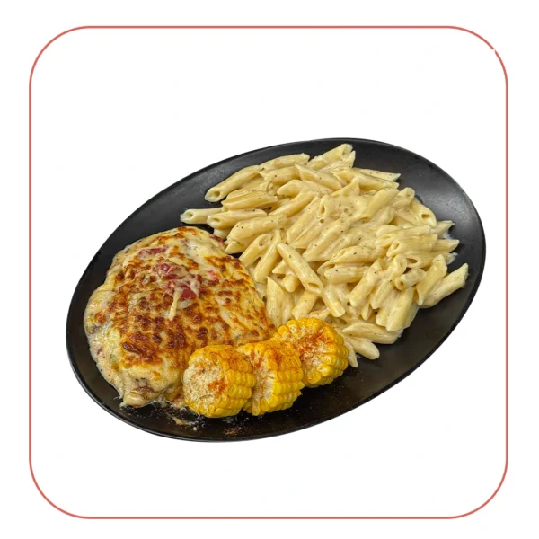 قطعتين من صدور الدجاج المشوي، فلفل الوان، بصل، بسطرمة ممزوجة بالصوص الكريمي مغطاه بطبقة من الجبنة الموتزاريلا